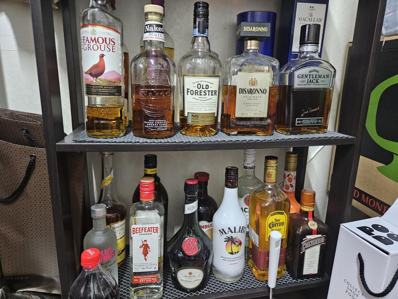 제일 밑 칸은 여러 칵테일들 예전에 좀 만들어 먹었어서 있는 술들이구요, 요즘은 좀 귀찮아서 안 먹긴 합니다. 나름 희귀한 리큐르인 D.O.M 이나 드람뷔도 있구요, 칼바도스도 있습니다. 2층은 뭐 통칭 스카치 위스키 칸입니다. 몇몇 함정카드가 있긴 하지만 그래도 뒤에 글랜그란트 15년, 맥캘란 더블 12년, 글랜파클라스 12년 정도가 있습니다.