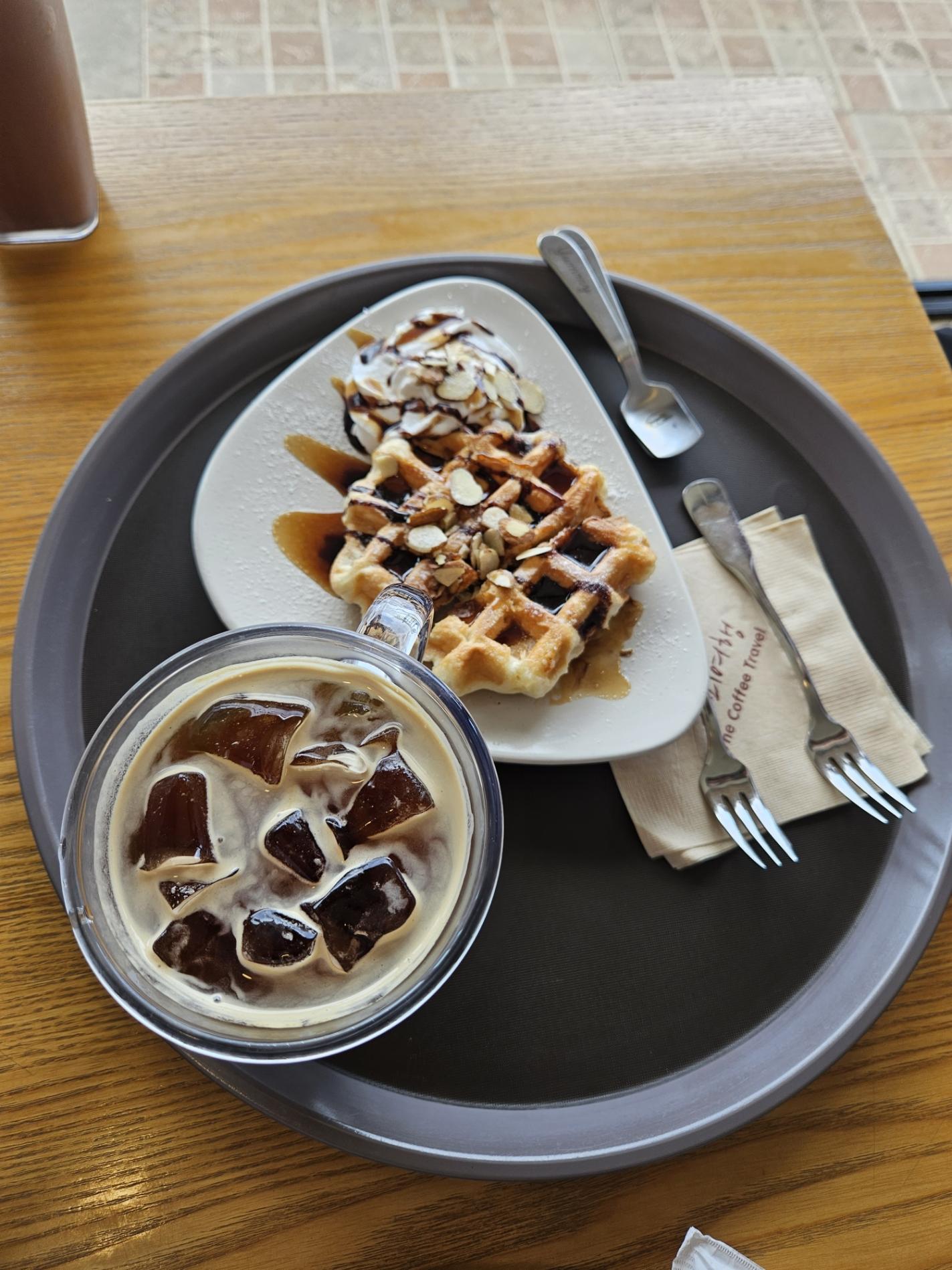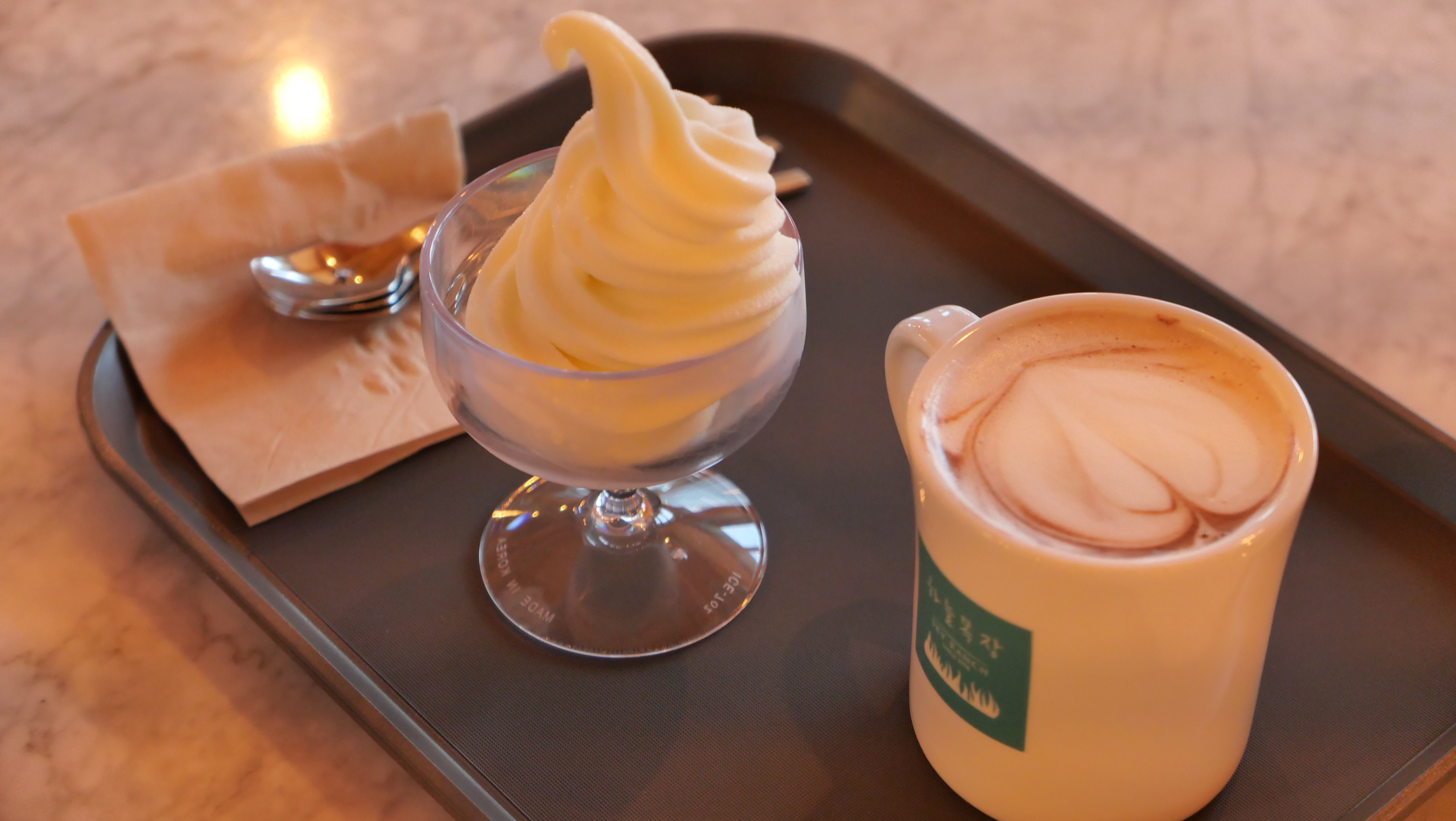 하기 전에 차를 너무 오래 타서 잠깐 쉴 겸 들어가자마자 바로 안에 있는 카페로 진입해서 아이스크림과 라떼를 먹었습니다. 맛나요 맛나